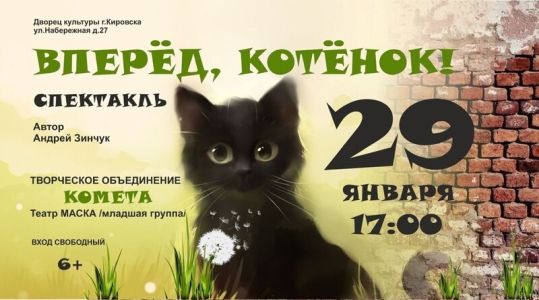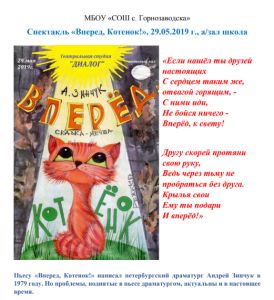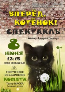 И в августе же Оксана Изотова, композитор из Перми, написала автору о том, что она выпустила мюзикл "Вперед! Смелей! К мечте!" по мотивам пьесы "Вперёд, Котёнок!". Либретто А. Гостевой. Исполняет образцовый ДМТ "Отражение". Режиссёр Н. Парфёнова. С помощью поисковиков Интернета удалось выяснить, что пьеса "Вперед, Котенок!" была поставлена: = в городе Долгопрудный в ДШТИ "СемьЯ" (видео):