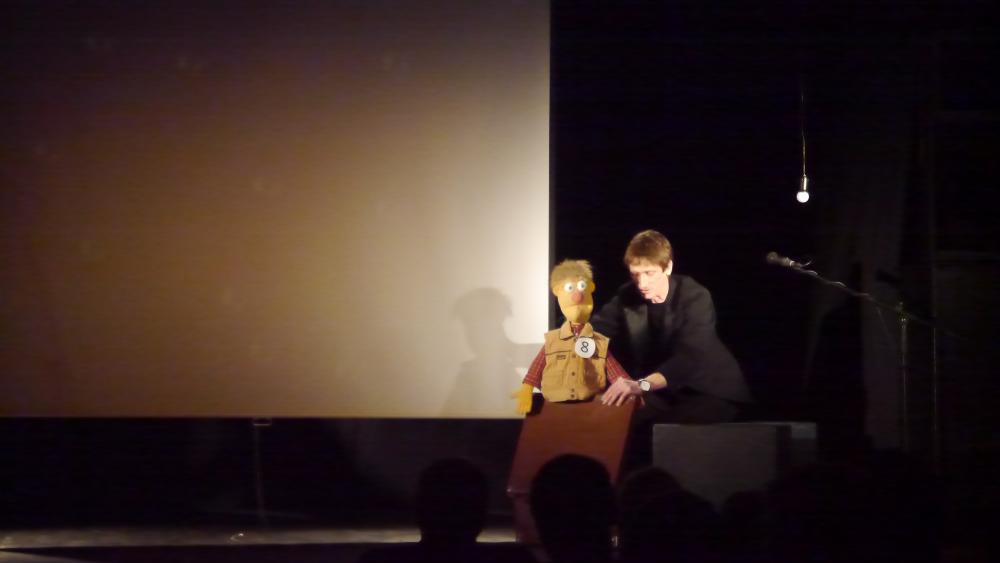 На сцене артист Юрий Орлов из городского театра кукол с хорошим "петрушечным" текстом - в качестве конферансье он ведет фестиваль: обыграл восьмерку как знак бесконечности, потом "положил" ее на бок и обыграл как тандем, потом еще как-то и еще... Устроил "фиктивные" (по уже сложившейся в России традиции) выборы куклы-партнера себе в тандем...