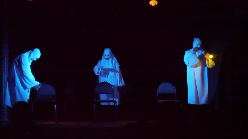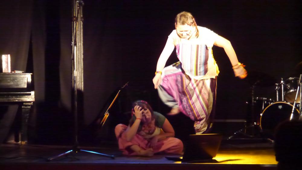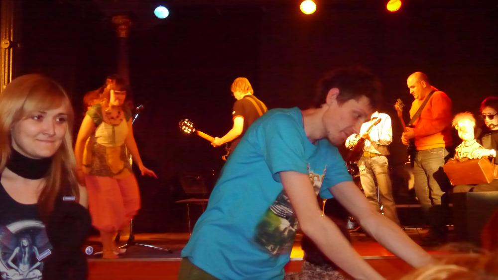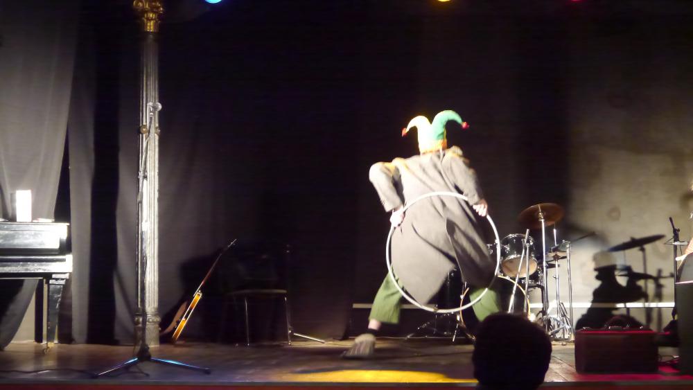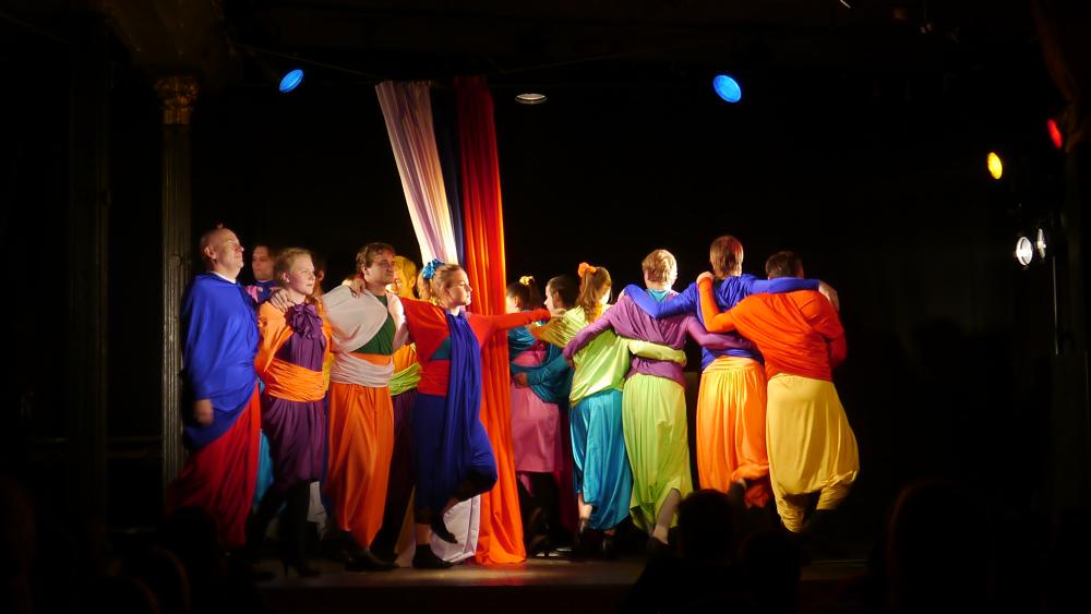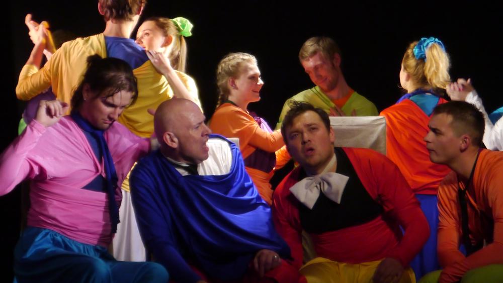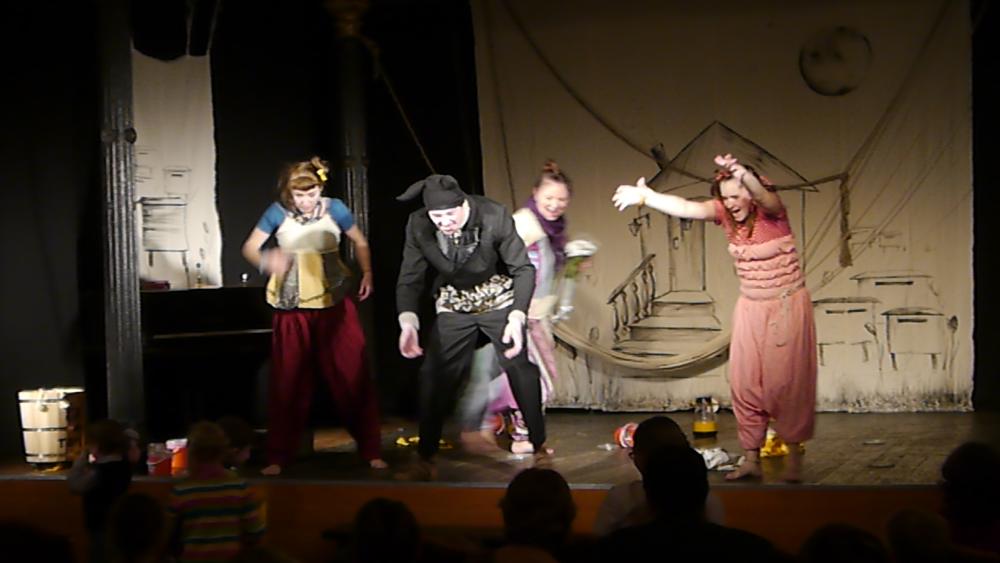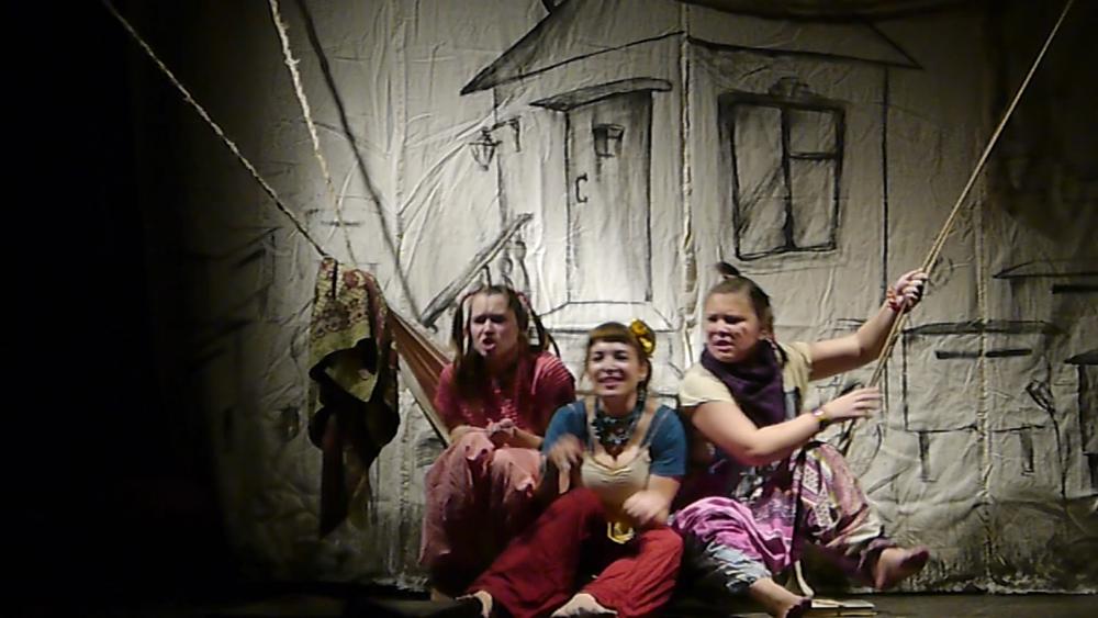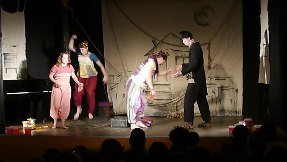 Актеры появляется в зале, как нам показалось, в одеждах кришнаитов... Потом, конечно, мы разобрались, что это у них такие клоунские трансформируемые наряды. Но, честно говоря, было уже поздно: "кришнаиты" так крепко засели у нас в головах, что до самого окончания спектакля мы, как ни старались, так и не смогли от них отделаться: