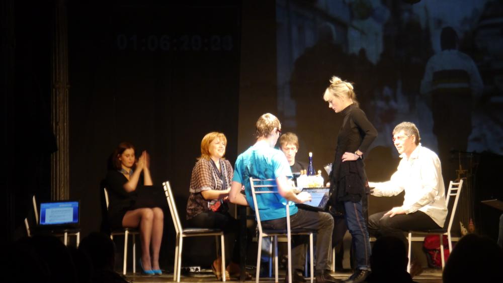 Сразу же после спектакля объявлен традиционный "СлиF" – экспресс-обсуждение только что увиденного, когда на высказывание своего мнения каждому из зрителей дается не больше минуты. При этом запрещено вступать в дискуссию и задавать вопросы. А вот нам, "профессиональным зрителям", дается аж по пяти минут! (это хорошо придумано). Но фотографии именно этого "СлиF"-а не получились - в кадре все оказалось смазанным. Так что "СлиF" будет позже.